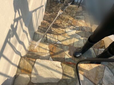 長年付着した汚れやカビ、苔、旧塗膜などをキレイに洗い流し、塗料の密着性を高めます。