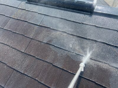 屋根の上から順番に、古い塗膜、汚れ、苔、カビ、藻などをきれいに洗い流していきます。