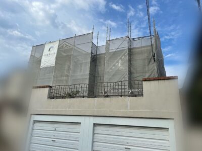 足場を設置したら、必ず足場全体にメッシュシートを張ります。