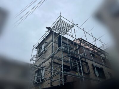いたしました。社長による完工検査も終わり、工事最終日の職人さんの作業の様子と足場解体作業の様子を