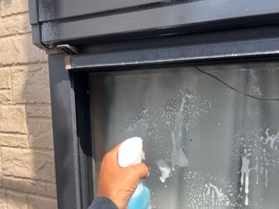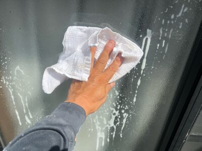 窓や笠木、ベランダ手摺りなど綺麗に拭き掃除を行います。