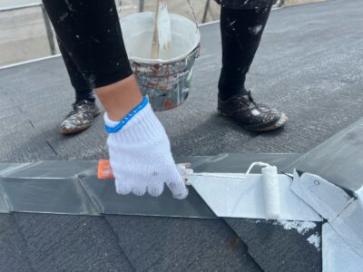 棟板金の下塗り、錆止め塗料を塗布します。これは、錆を防止・抑制するための工程です。