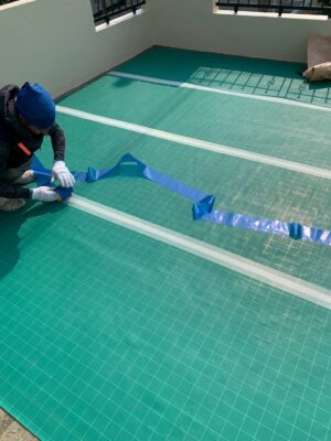 通気緩衝シートを敷き詰めたら、次に通気緩衝シートのジョイント部分にジョイントテープ、端部には専用のテープ