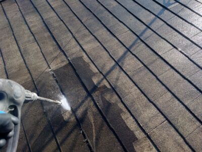 高圧洗浄作業は屋根から作業をスタートし、外壁、ベランダ、外構、土間まわりとすすめていきます。