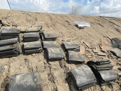 瓦を一枚ずつ外し、葺き土などは土嚢袋に入れていきます。