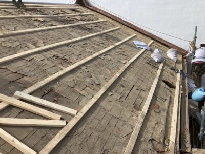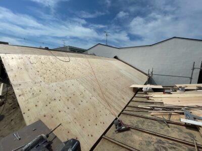 新しく取り付けた母屋の上に、新しい野地板を隙間なく張っていきます。