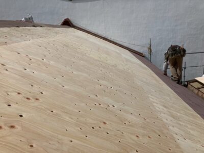 前回は既存の屋根(瓦)を撤去し、野木板の増し張りの作業の様子をお伝えさせていただきました。
