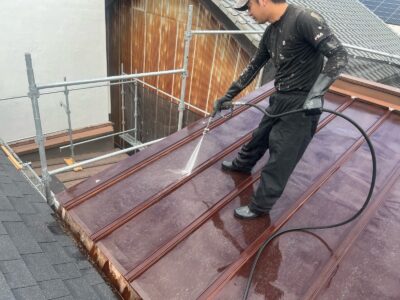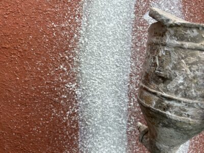 長年付着した汚れやカビ、苔、旧塗膜などをキレイに洗い流し、塗料の密着性を高めます。