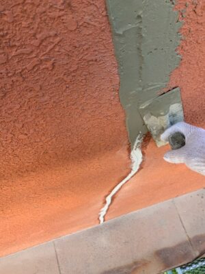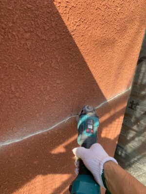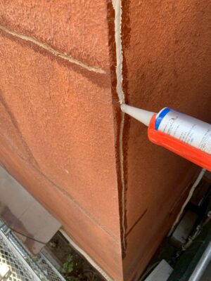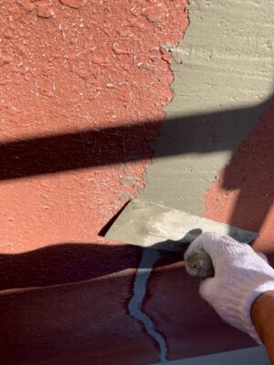 シーリング材の表面が硬化した後、モルタルで外壁を元の状態に戻す作業です。