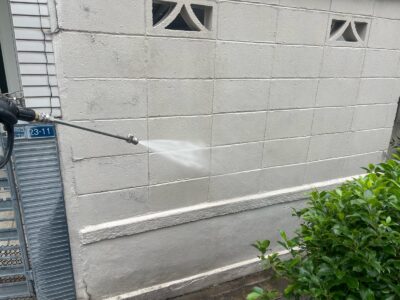 本日は、外壁の下地処理作業、高圧洗浄作業の様子をご紹介したいと思います。