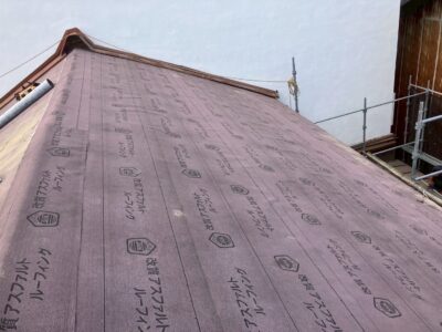 下地の上に防水シートを軒先から棟に向かって重なるように張っていきます。