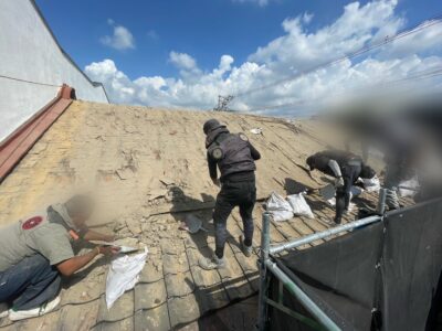 瓦を一枚ずつ外し、葺き土などは土嚢袋に入れていきます。