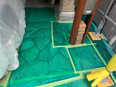 します。また、窓枠や玄関、タイルなど塗装しない部分に塗料が付着しないようにビニールシートで保護します。