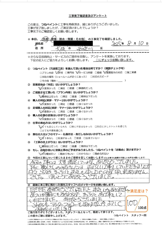 この度は、大阪市外壁塗装専門店つねペイントに工事のご依頼をいただき、誠にありがとうございました。