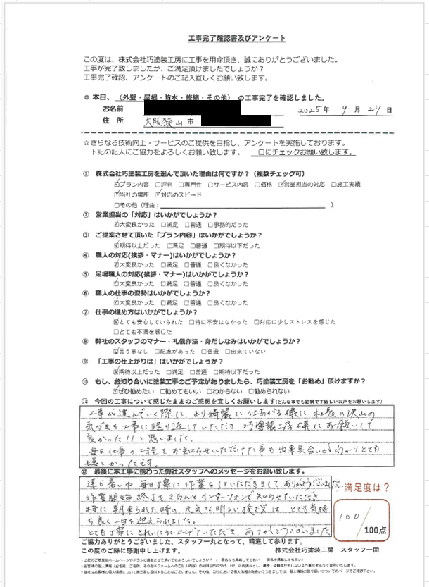 この度は、大阪市外壁塗装専門店巧塗装工房に工事のご依頼をいただき、誠にありがとうございました。