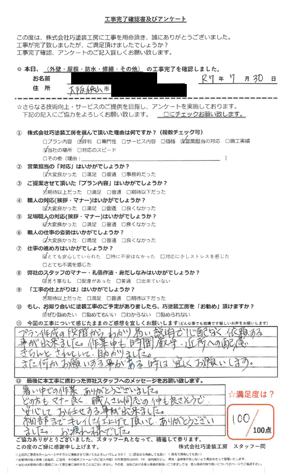 この度は、大阪市外壁塗装専門店つねペイントに工事のご依頼をいただき、誠にありがとうございました。