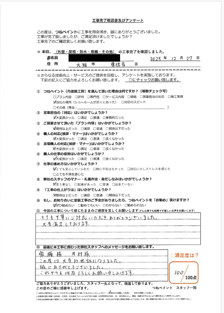 この度は、大阪市外壁塗装専門店つねペイントに工事のご依頼をいただき、誠にありがとうございました。