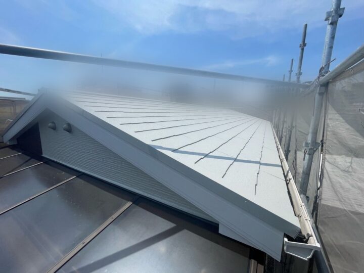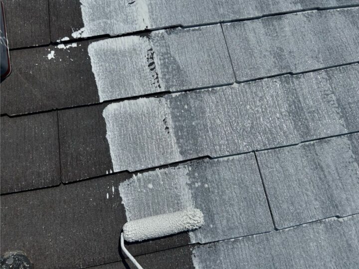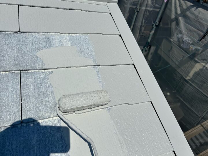 中塗りは、仕上げ塗装に厚みを持たせる事ができるので、塗料の機能を長持ちさせる効果があります。屋根:上塗り