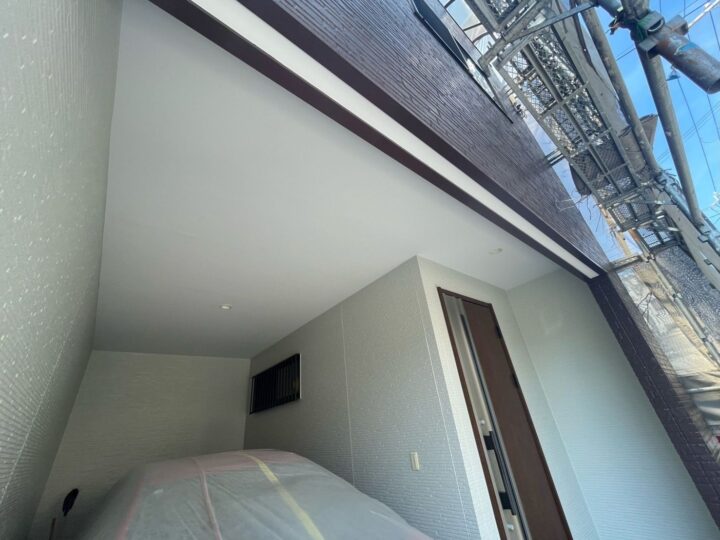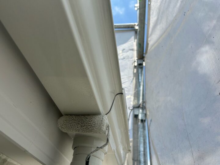 雨樋も、紫外線や雨風に晒され劣化します。雨漏りの原因にもなる部分ですのでしっかりと塗っていきます。雨樋:塗装