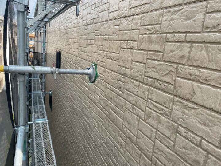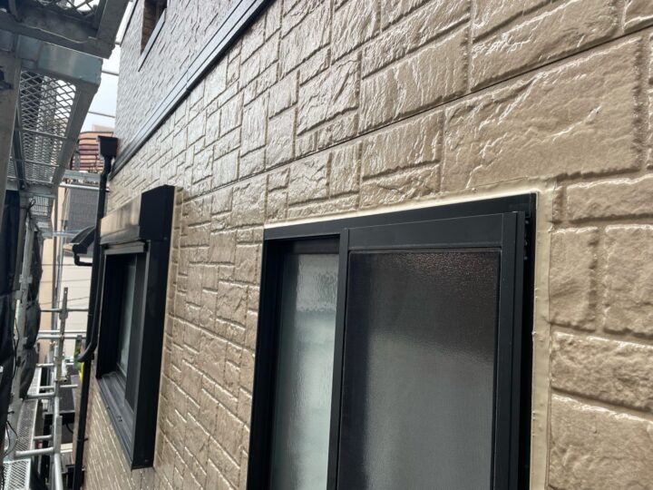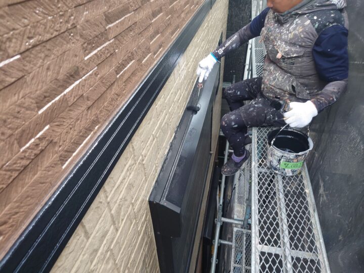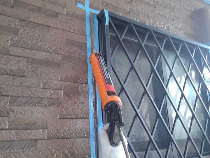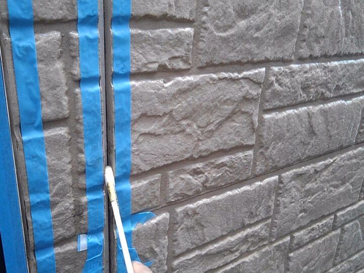 スーパーガルテクト施工で最後に、継ぎ目となる部分にシーリング材をなじませ仕上げます。外壁:クリヤー塗装(1回目)
