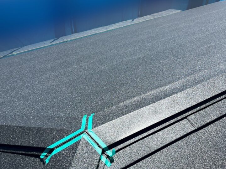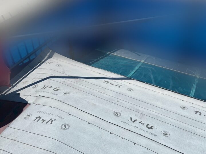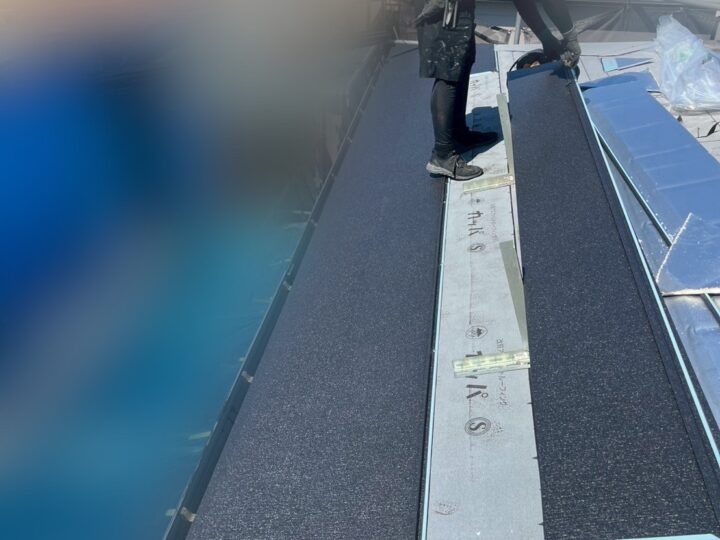 防水シート(ルーフィング)敷設作業になります。屋根の軒先(低いところ)から、棟(高いところ)に目がけて新しい防水シートを敷き詰めます。屋根:カバー工法(スーパーガルテクト)