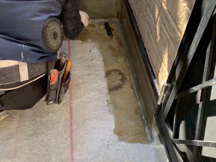 ポリエステル樹脂の塗布とガラスマットの貼り付けを行います。その際には脱泡ローラーを用いてマット内にある空気を抜き、ガラスマットに樹脂をしっかり浸透させます。ベランダ:FRP防水