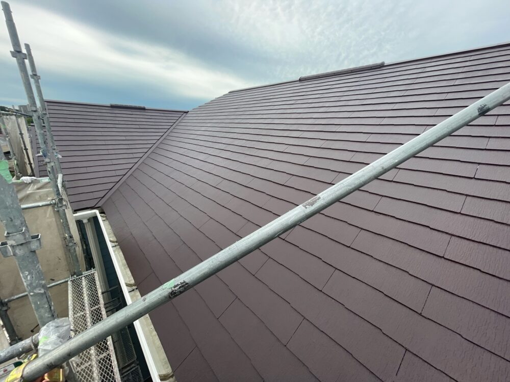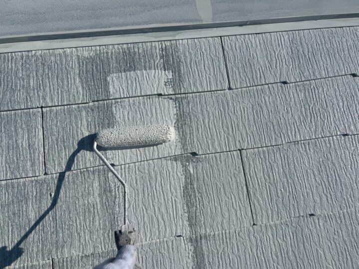 中塗りは、仕上げ塗装に厚みを持たせる事ができるので、塗料の機能を長持ちさせる効果があります。屋根:上塗り